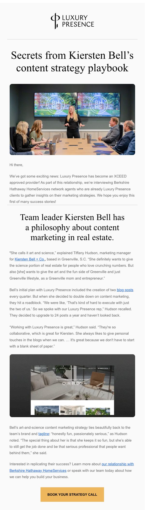These emails are all designed to demonstrate how Luxury Presence helps real estate professionals succeed, encouraging readers to get in touch with Luxury Presence’s sales team and book a demo.